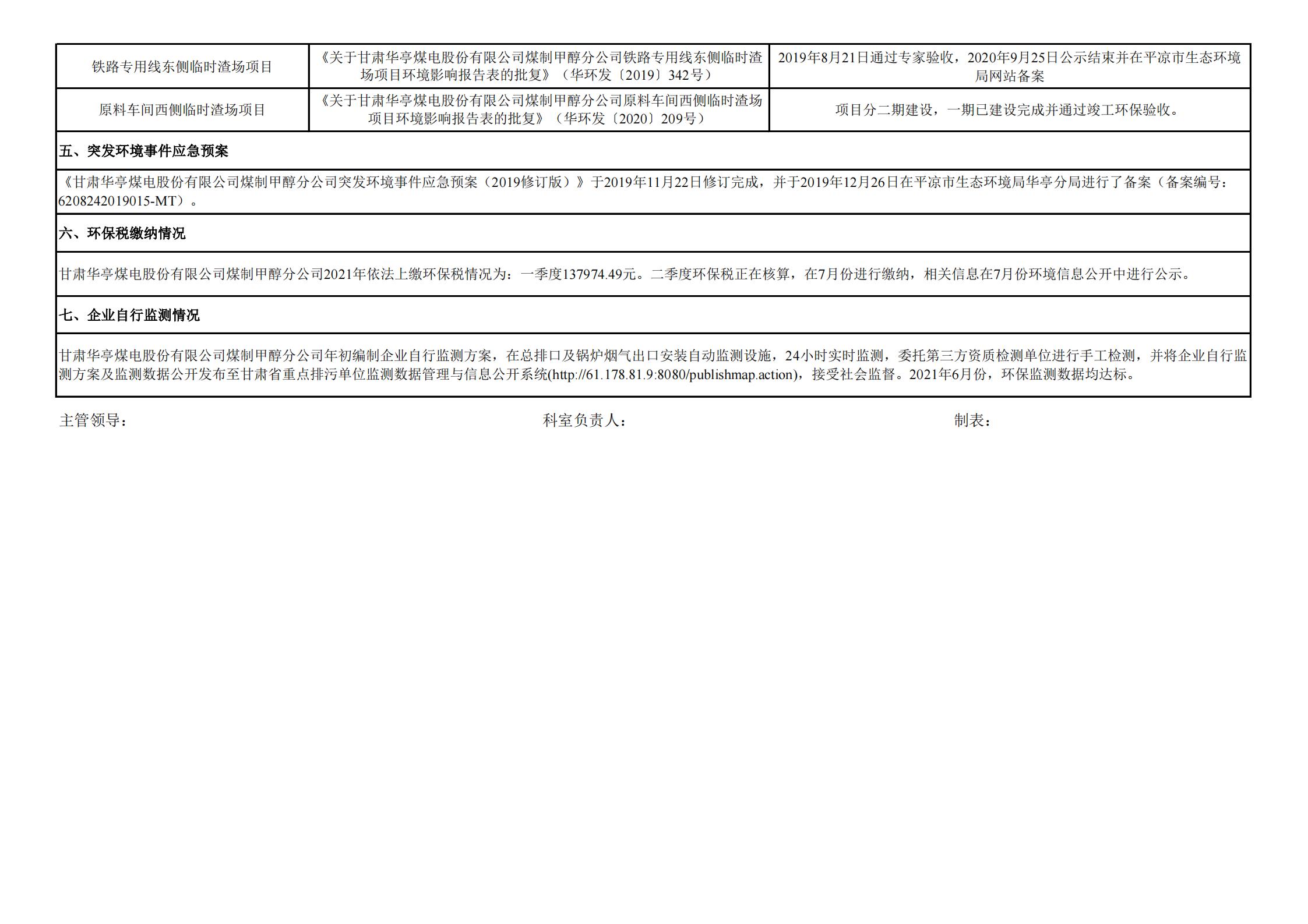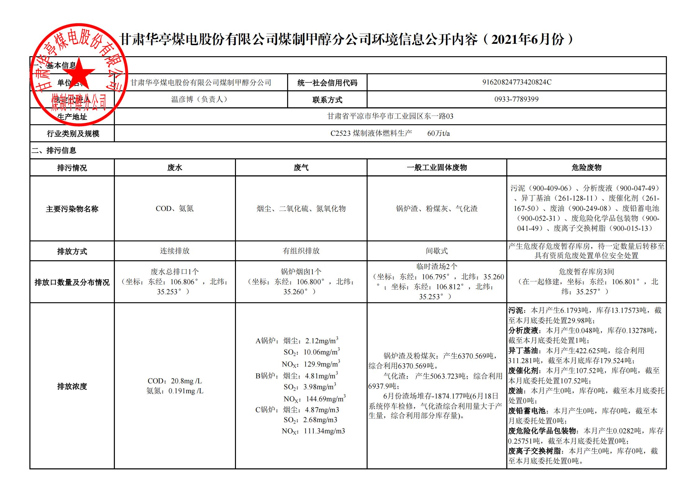 煤制甲醇分公司環(huán)境信息公開內(nèi)容(2021年06月)