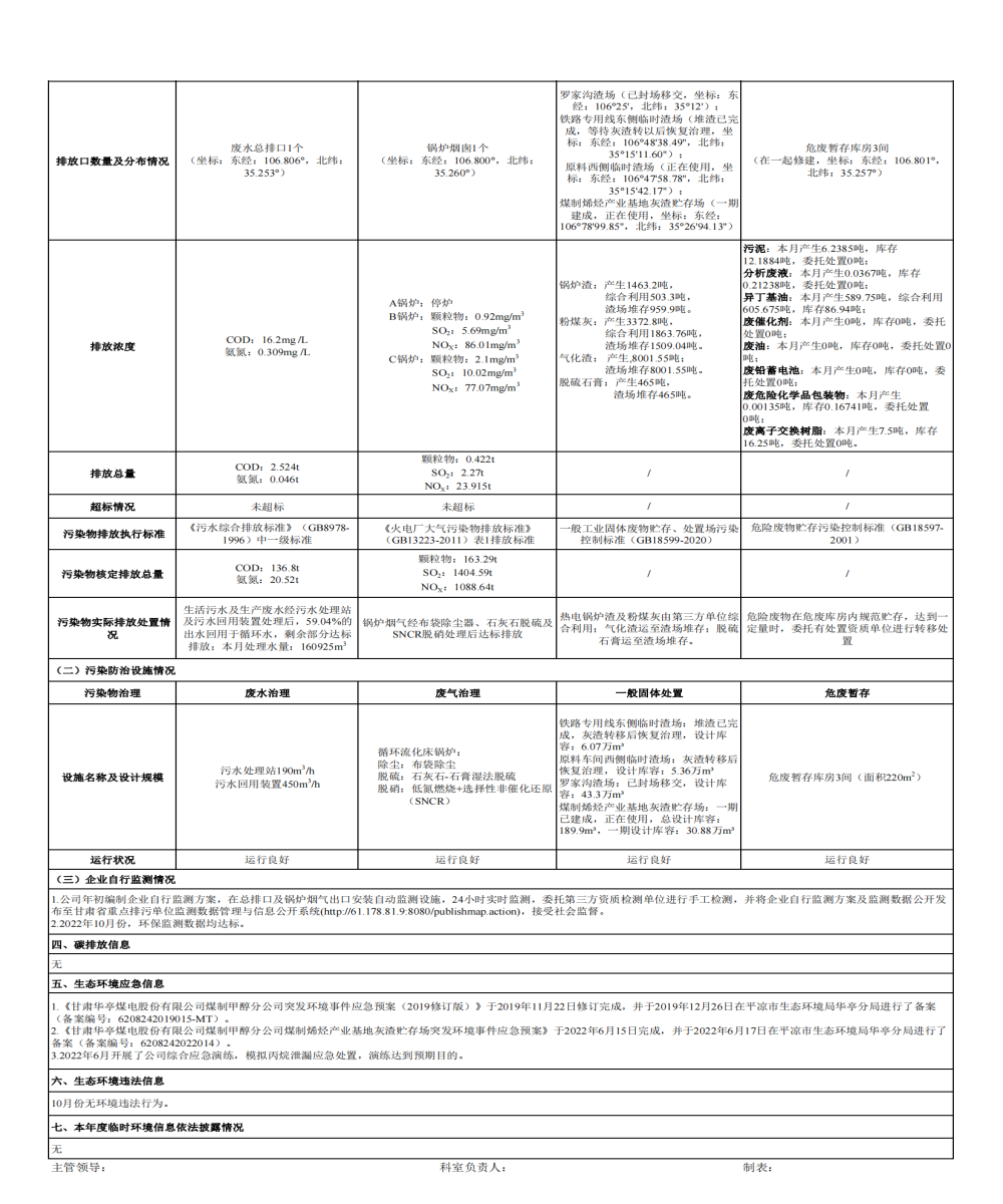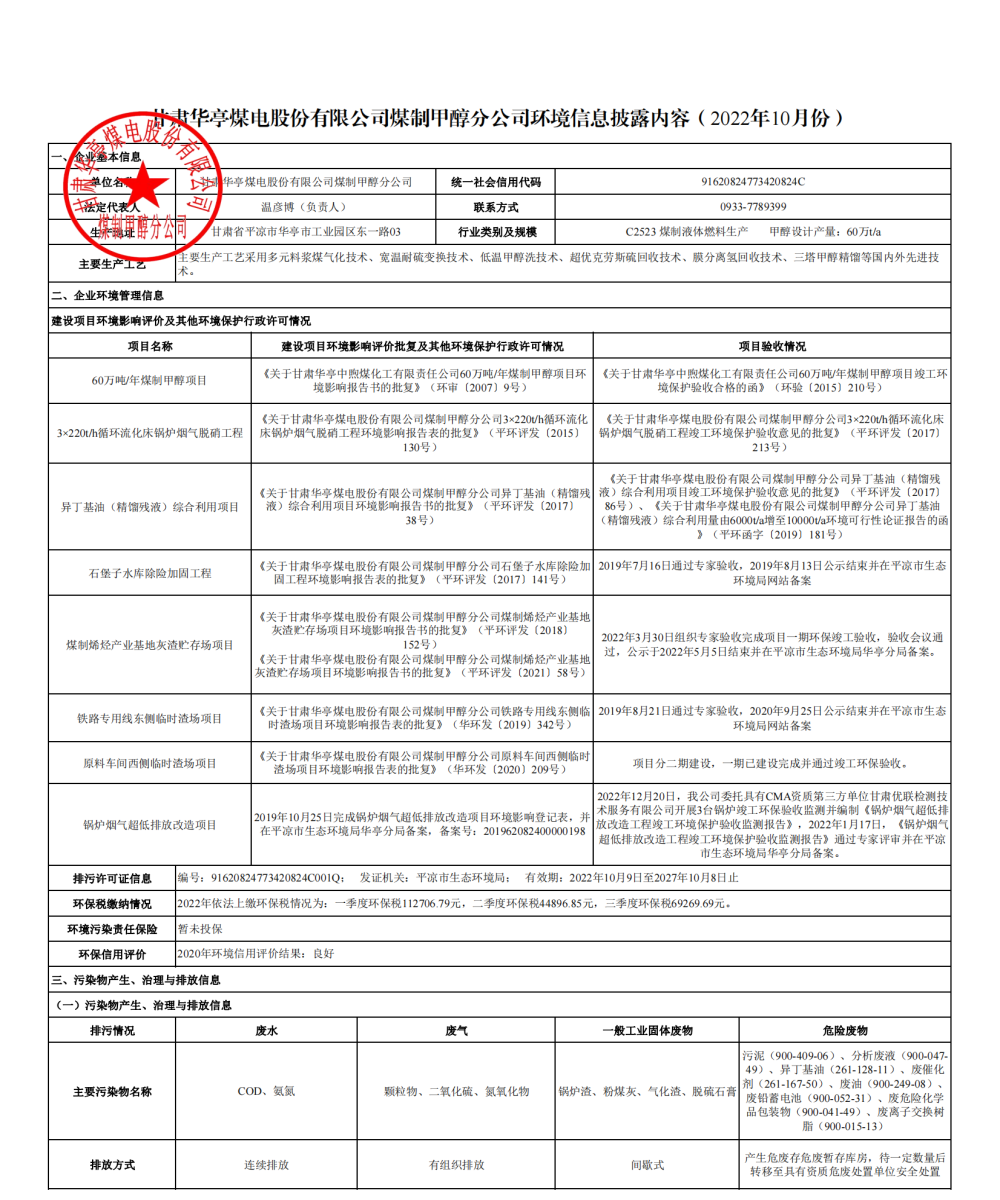煤制甲醇分公司環(huán)境信息公開內(nèi)容(2022年10月)